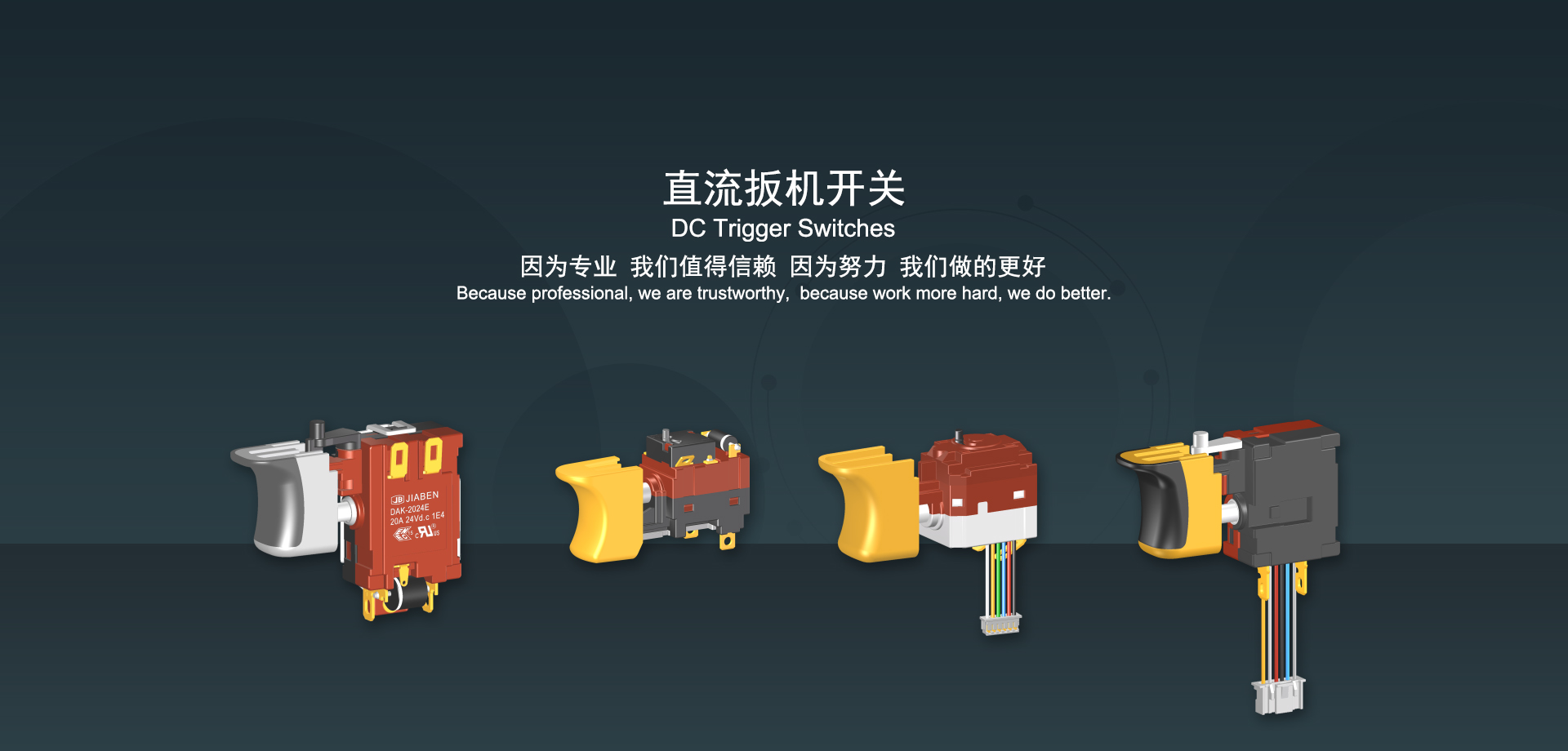 浙江佳奔電子有限公司始建于1986年,坐落于浙江省樂清市虹橋鎮(zhèn)東電子信息產(chǎn)業(yè)園內(nèi),現(xiàn)有職工700多人,資產(chǎn)總額超3億元。公司主要經(jīng)營“JIABEN”牌微動開關(guān)、蹺板開關(guān)、按鈕開關(guān)、扳機開關(guān)、調(diào)速開關(guān)和電位器開關(guān)等各類交、直流器具開關(guān)和各類交、直流線路板模塊等產(chǎn)品,主要應(yīng)用于交、直流電動工具、電動園林工具、清潔器具、家用電器和小型機床等行業(yè),是集產(chǎn)品設(shè)計、研發(fā)、制造、銷售和服務(wù)于一體的國家高新技術(shù)企業(yè)。JIABEN was founded in 1986, located in East Electronic Information Industry Park, Hongqiao Town, Yueqing City, Zhejiang Proviance, existing staff more than 700 peoples, more than 300 million RMB worth of assets. Company is mainly engaged in "JIABEN" brand Micro Switch, Rocker Switch, Push-button Switch, Trigger Switch, Speed Regulating Switch, Potentiometer Switch and other kinds of appliance switch and all kinds of AC or DC circuit board module, such as more than 100 series, 8000 kinds of models of products, mainly used in AC or DC Power-tools, Power Gardening Tools, Cleaning Appliances, Household Appliances and Small Machine Tool and other industries, is the collection product design, research and development, manufacturing, sales and service in one of the national high and new technology enterprise.